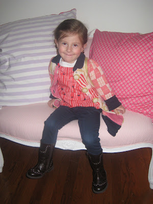 If not in her dress, this is how she dresses herself: color on color ("because it matches") and an expired holiday Hello Kitty t-shirt...